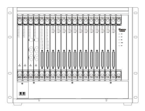 機框為19英寸標準機箱,可選擇壁裝和標準機架安裝。環(huán)路中繼和用戶可實現(xiàn)在規(guī)定容量內任意配置。各單元板排序為MCU->CCS->FXO->FXS->PWR,見下圖。