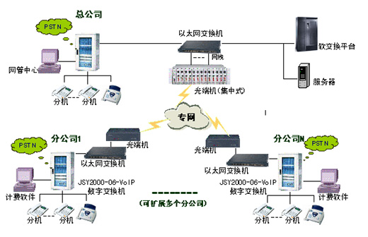 3、對已加裝數(shù)字交換機的公司,在保留原有設備上配置網(wǎng)關,通過公司的數(shù)據(jù)專網(wǎng)注冊到總公司的軟交換平臺,平臺給其分配內(nèi)網(wǎng)的號碼。這樣,在不淘汰原有設備的情況下,已有數(shù)字交換機的部門依然可以與網(wǎng)內(nèi)的其他終端進行免費通話。