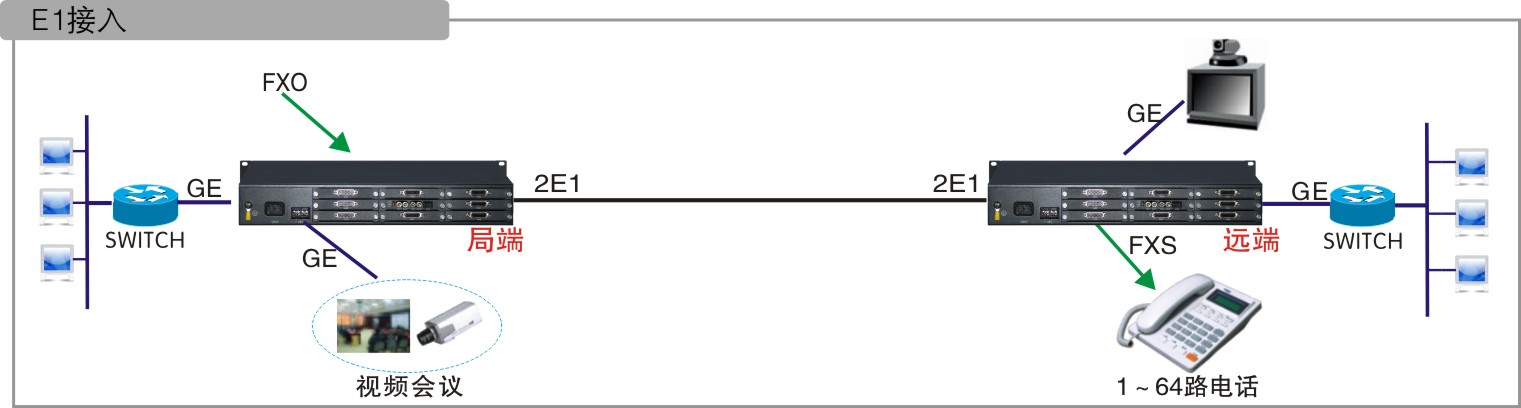選擇E1通道傳輸時,任意1個E1可以傳輸64路語音